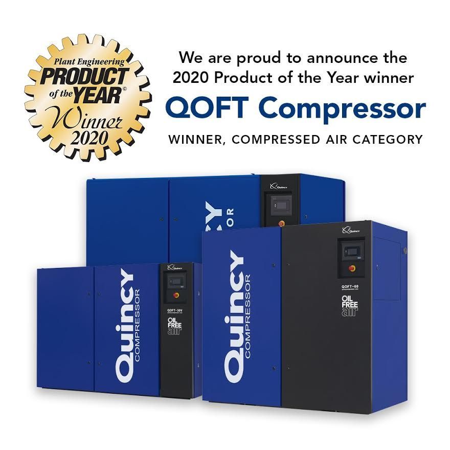 Quincy Compressor’s QOFT Rotary Tooth Compressor has officially won Plant Engineering’s 2020 Product of the Year for the compressed air category. The Plant Engineering Product of the Year award is a reader’s choice, premier award for industry-leading products in manufacturing. It has been presented every April for the past 33 years.